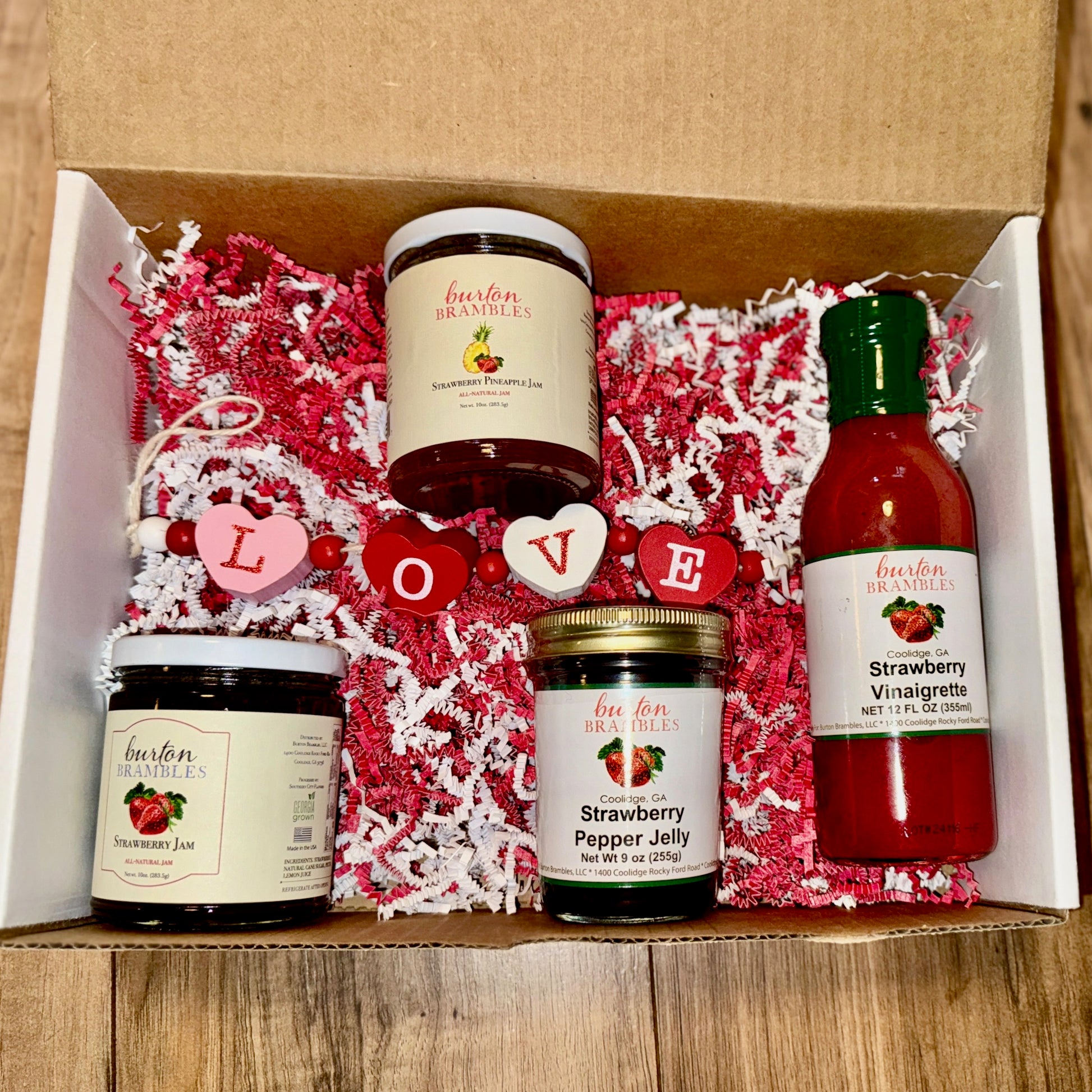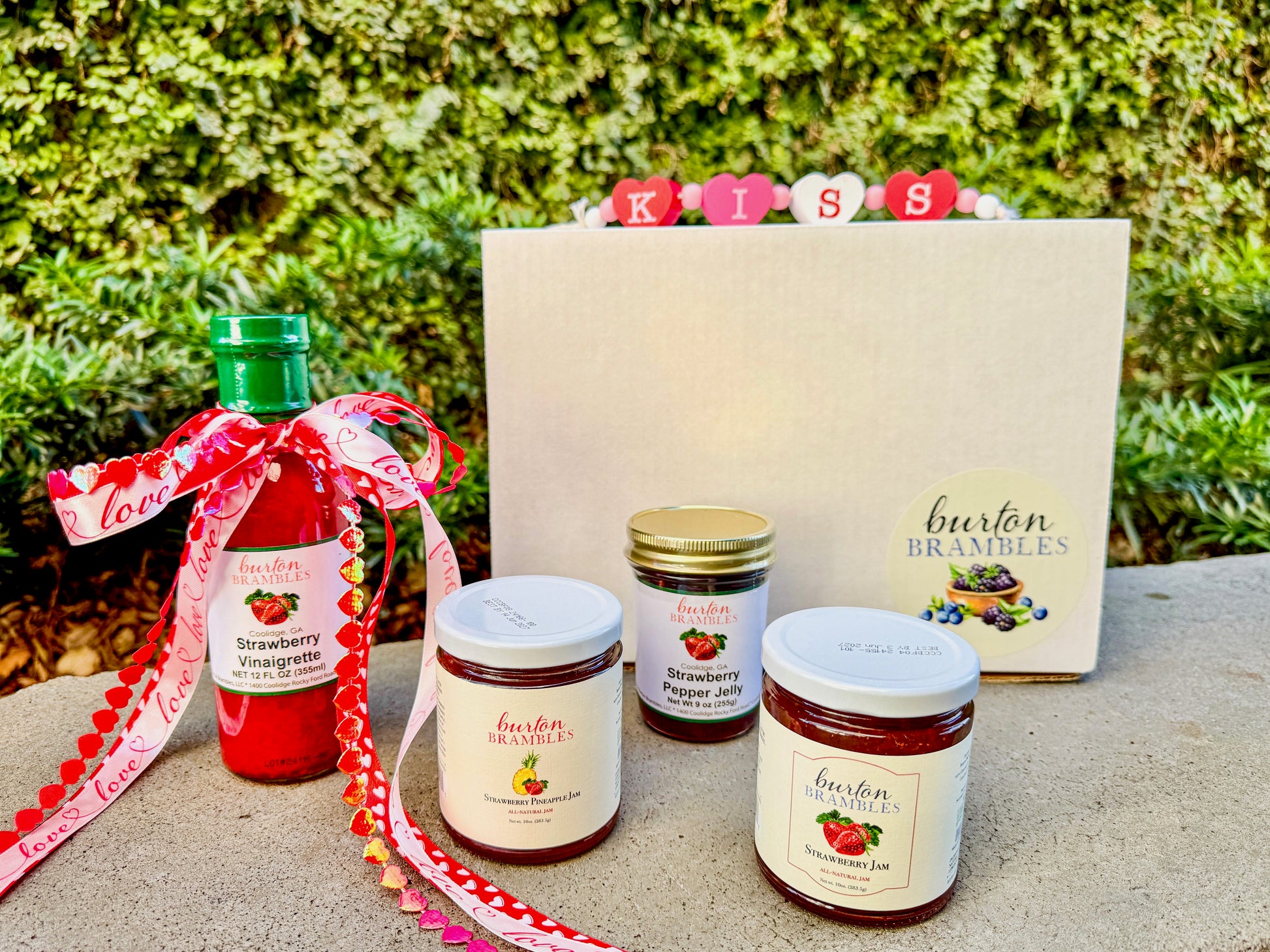 Sweeten your Valentine's Day with the perfect blend of fruity, tangy, and spicy flavors in our Sweetheart's Strawberry Bliss box. This delightful collection is crafted for those who savor the sweet side of life, with luscious Strawberry Jam and tropical Strawberry Pineapple Jam to spread on toast or incorporate into your dessert recipes. Add flavor with the zesty strawberry vinaigrette dressing- ideal for salads or drizzling over roasted veggies. For a touch of excitement, the Strawberry Peppery Jelly delivers a sweet and spicy kick that will elevate any cheese board or meal. Whether you're preparing a romantic breakfast or a savory dinner, this box will make every moment a little more blissful.