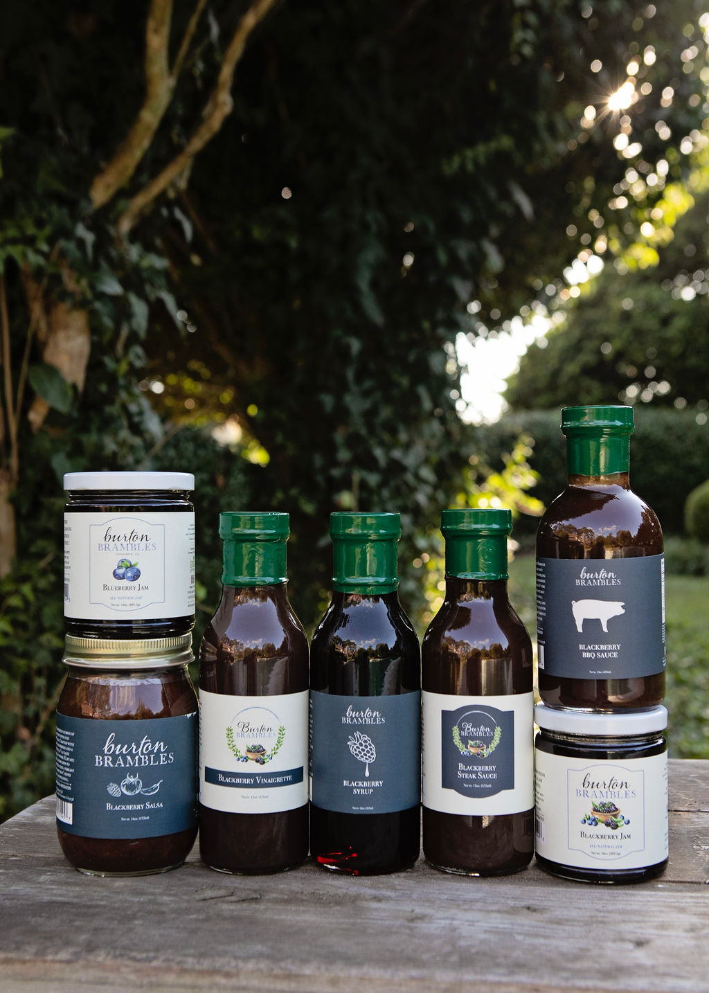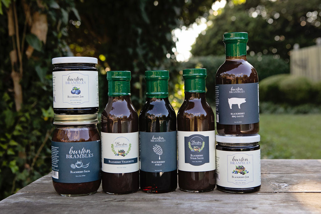 The Bramble gift box includes blackberry barbecue sauce, blackberry jam, blackberry steak sauce, blackberry syrup, blackberry vinaigrette, blackberry salsa, and blueberry jam.